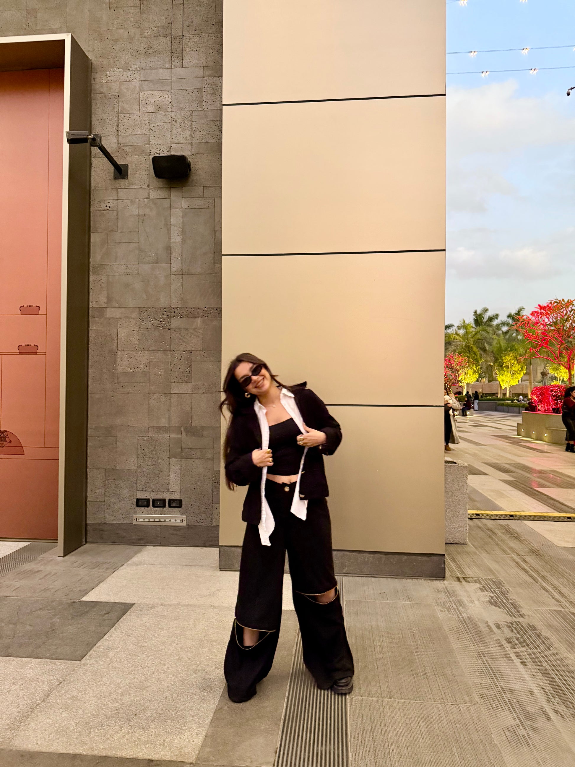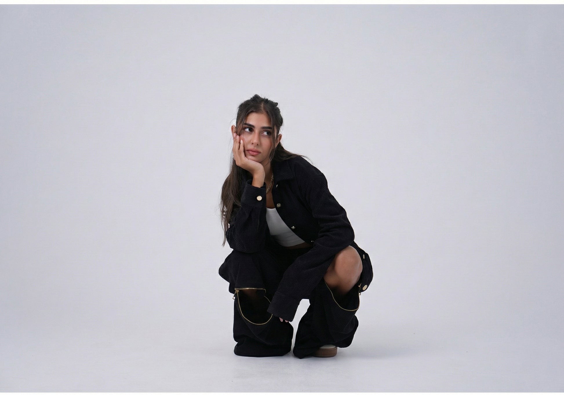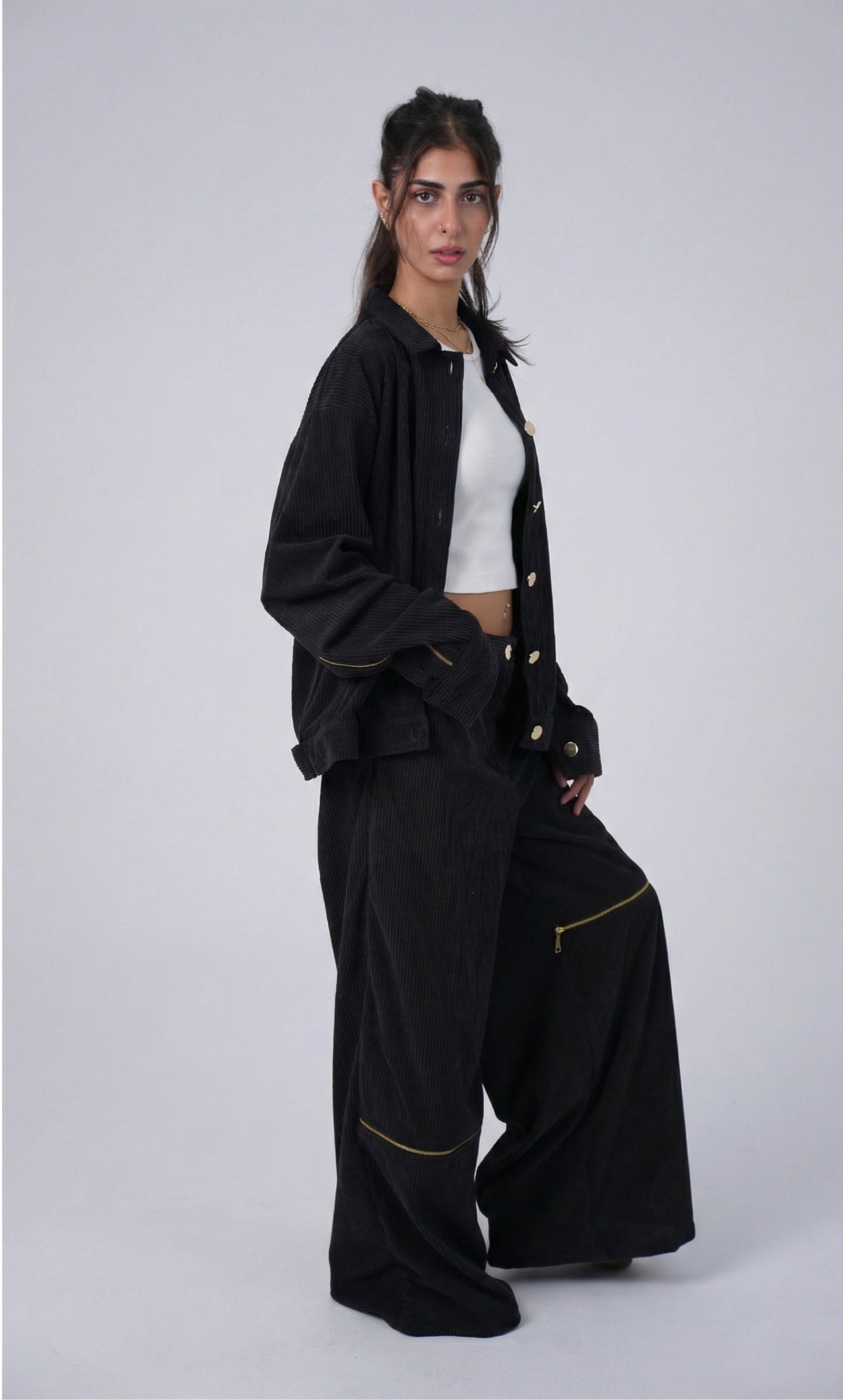 Each leg is detailed with a bold gold zippernear the knee, adding a distinctive, high-impact touch that transforms a simple trouser into a standout fashion piece.