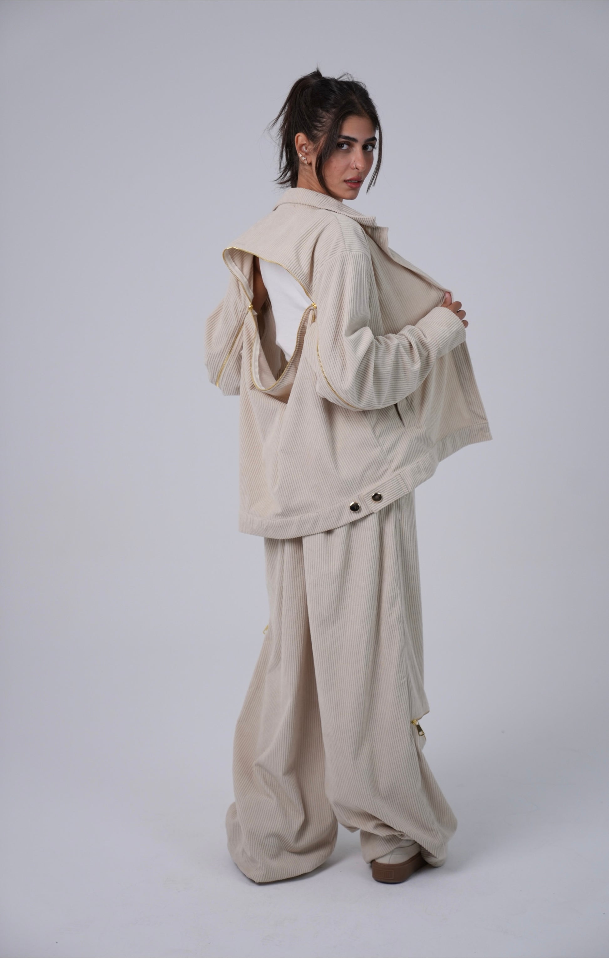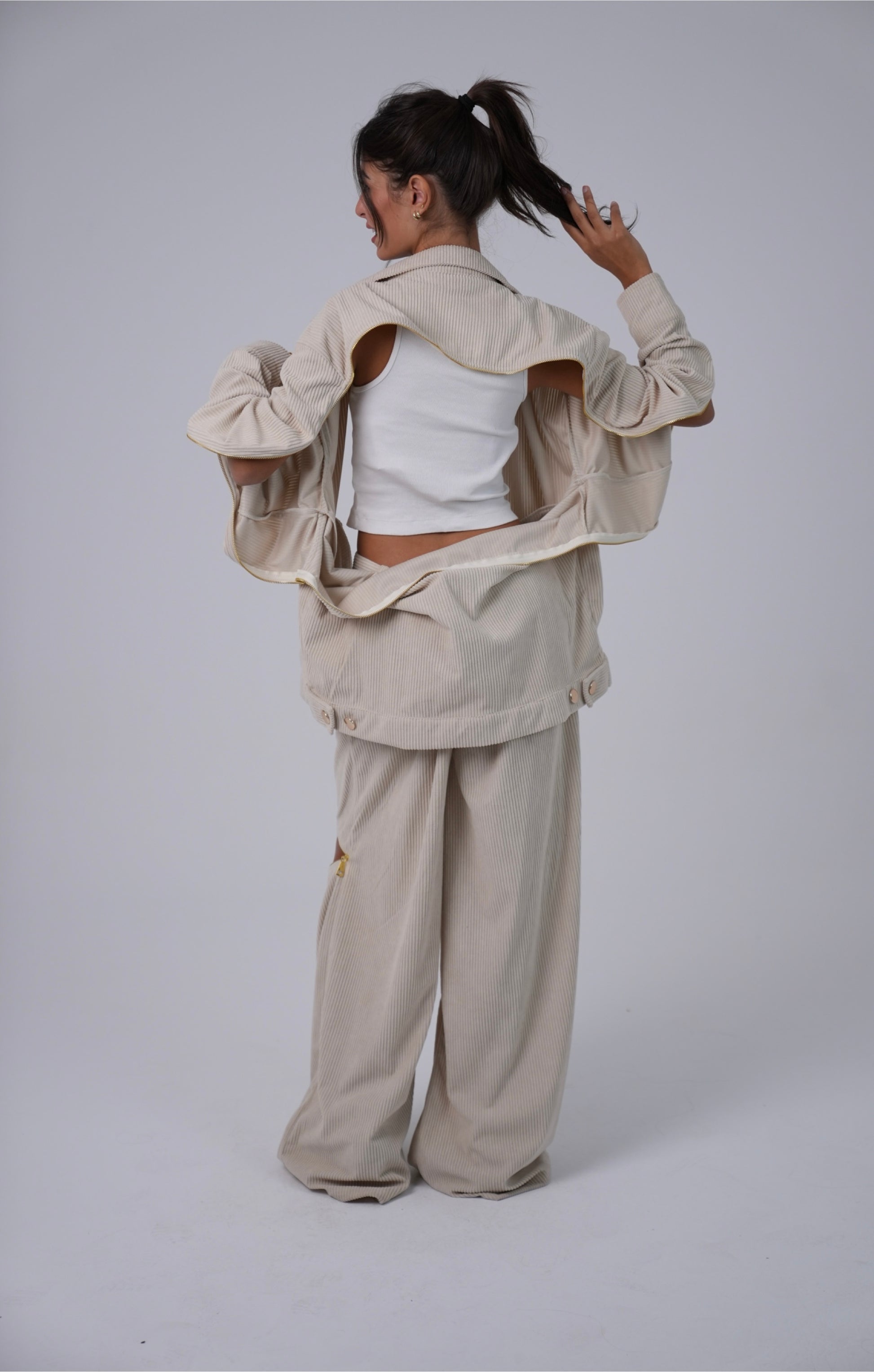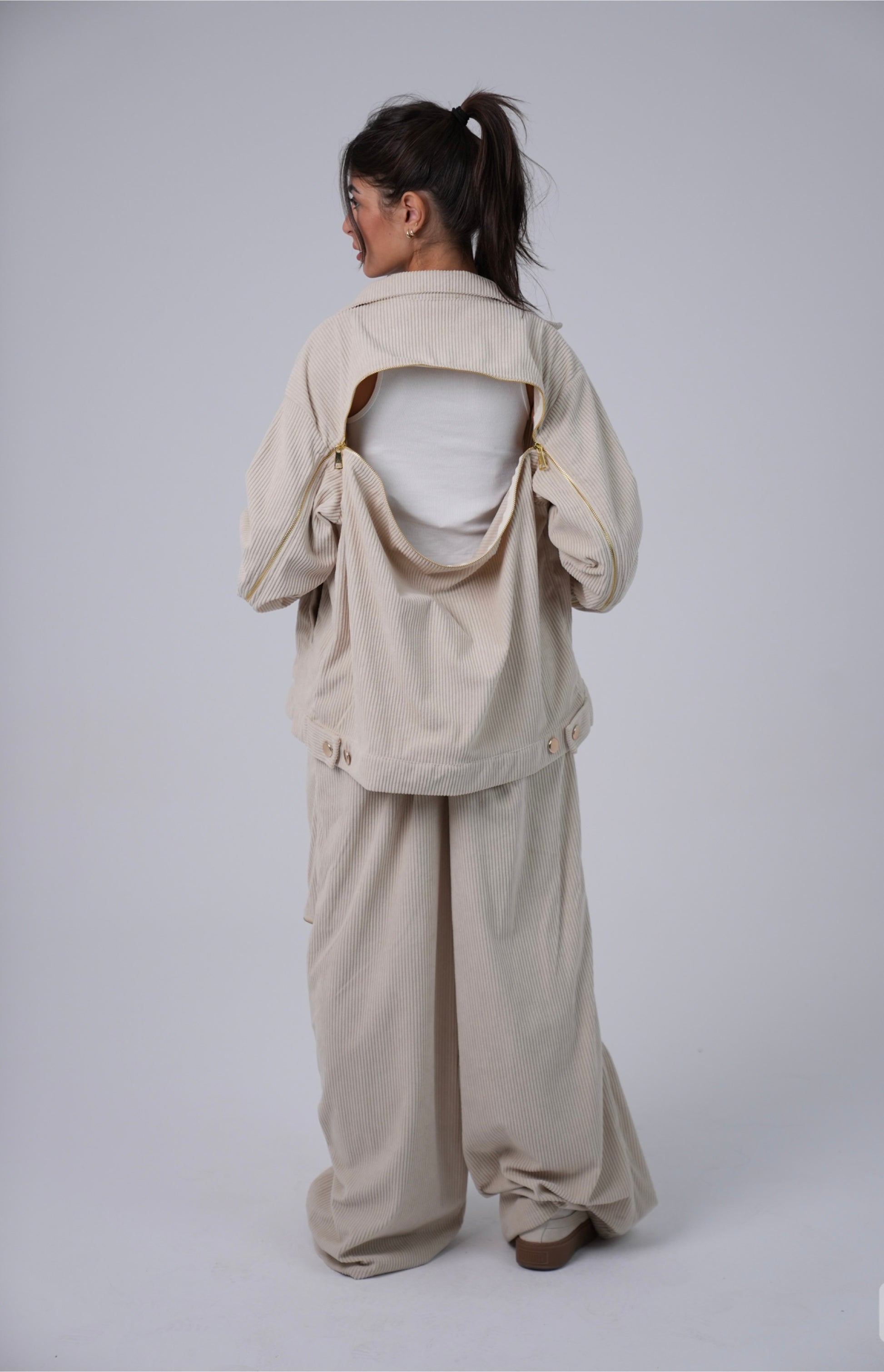 Featuring fully functional, rust-free zippers, this piece effortlessly transforms from a structured jacket to a bold, cropped statement.